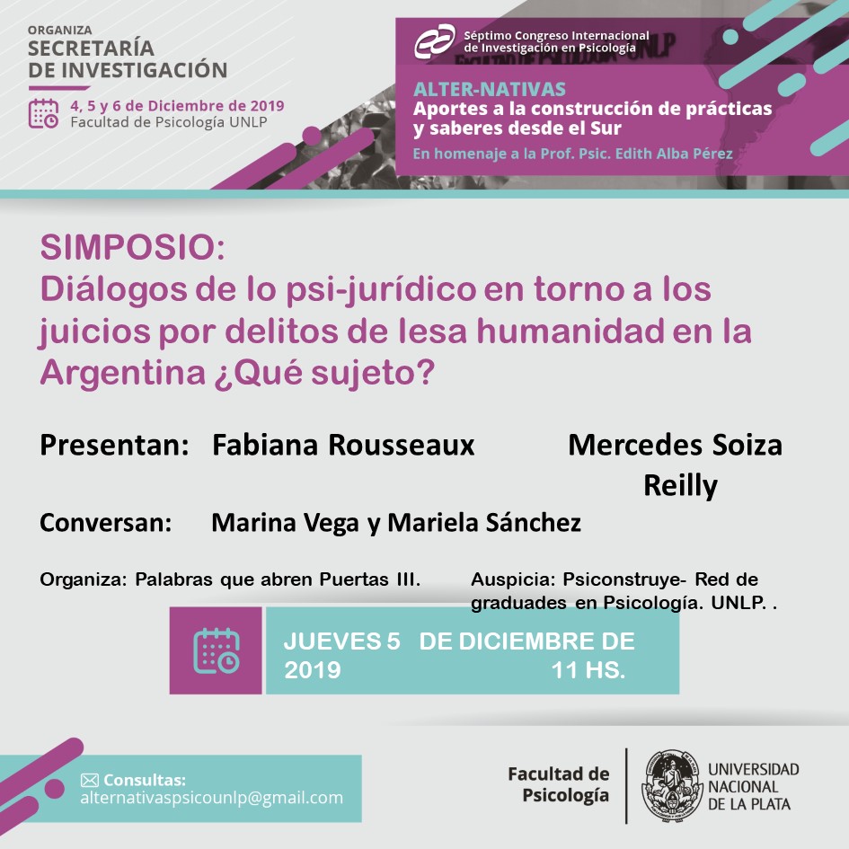 Facultad de Psicología de la Universidad Nacional de La Plata Calle 51 entre 123 y 124, Ensenada, Buenos AiresSéptimo Congreso Internacional de Investigación en Psicología SIMPOSIO Diálogos de lo psi-jurídico en torno a los juicios por delitos de lesa humanidad en la Argentina...